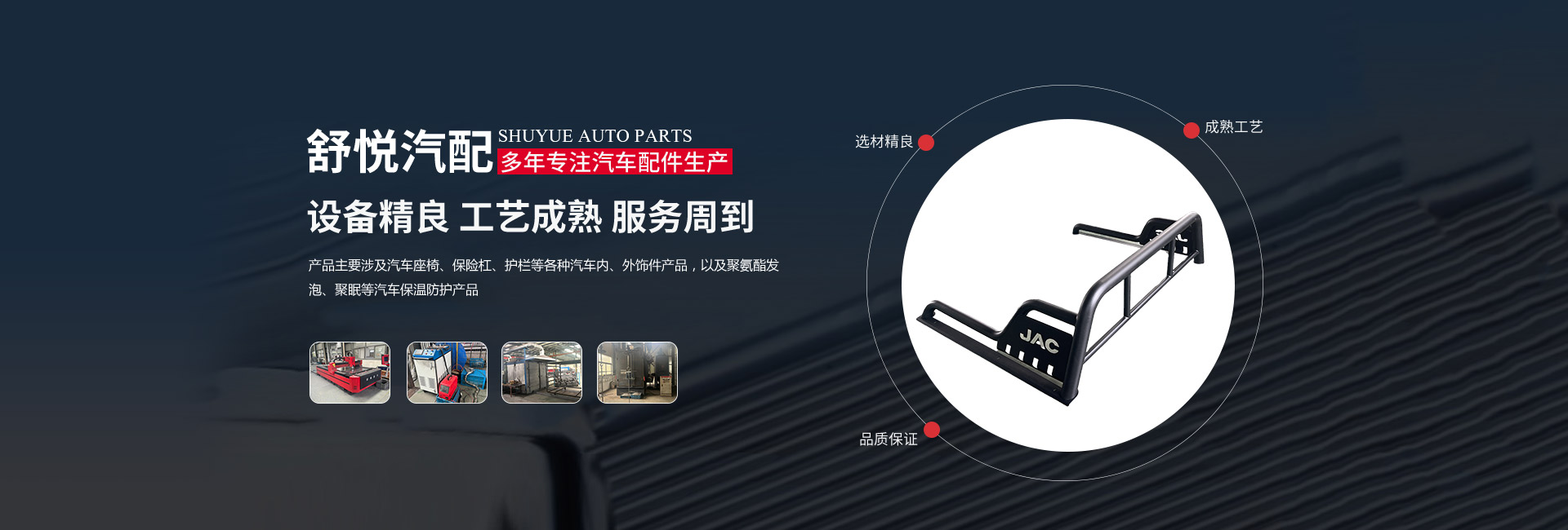 揚(yáng)州舒悅汽配有限公司經(jīng)過多年的穩(wěn)定發(fā)展,業(yè)績一直蒸蒸日上。公司產(chǎn)品主要涉及汽車座椅、保險杠、護(hù)欄等各種汽車內(nèi)、外飾件產(chǎn)品,以及聚氨酯發(fā)泡、聚脲等汽車保溫防護(hù)產(chǎn)品。其主要是為江淮、金龍,奇瑞等公司服務(wù),已連續(xù)多年成為江淮、金龍等公司的A級供應(yīng)商。        公司成立于1997年,現(xiàn)坐落于揚(yáng)州市儀征劉集盤古工業(yè)集中區(qū)202號,公司占地面積26640平 方米,廠房建筑面積18512平方米。公司擁有先進(jìn)的制造設(shè)備、可靠的生產(chǎn)工藝、完善的檢測手段和科學(xué)的管理,在售前和售后服務(wù)中做到快速反應(yīng),應(yīng)急應(yīng)變,為客戶提供優(yōu)良產(chǎn)品和滿意服務(wù)。公司的產(chǎn)品開發(fā)能力和生產(chǎn)規(guī)模在同行業(yè)中處于前列的地位。        揚(yáng)州舒悅?cè)吮小罢\信雙嬴”的原則,發(fā)揚(yáng)“誠信、務(wù)實、創(chuàng)新、貢獻(xiàn)”的企業(yè)精神,恪守“顧客至上”的經(jīng)營宗旨,致精從業(yè),不斷引進(jìn)新技術(shù)、新材料。以優(yōu)良的產(chǎn)品、合理的價格和周到的服務(wù)參與市場競爭。公司愿與國內(nèi)外朋友建立真誠的合作伙伴關(guān)系,攜手共創(chuàng)輝煌!